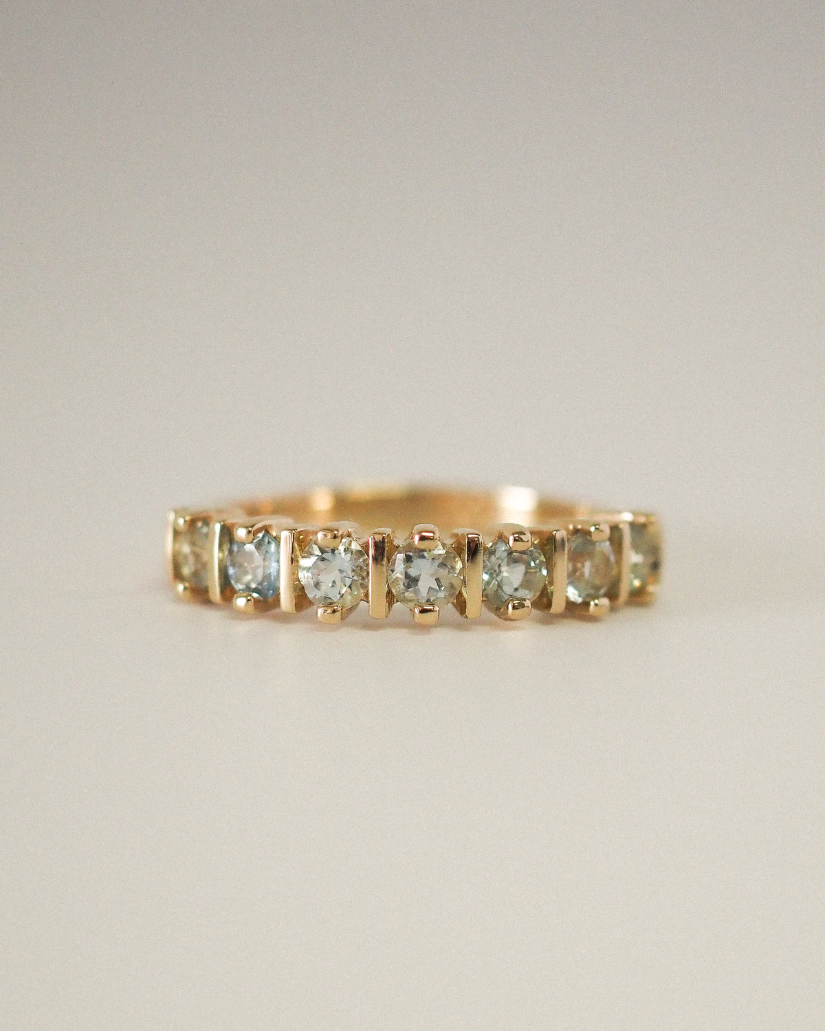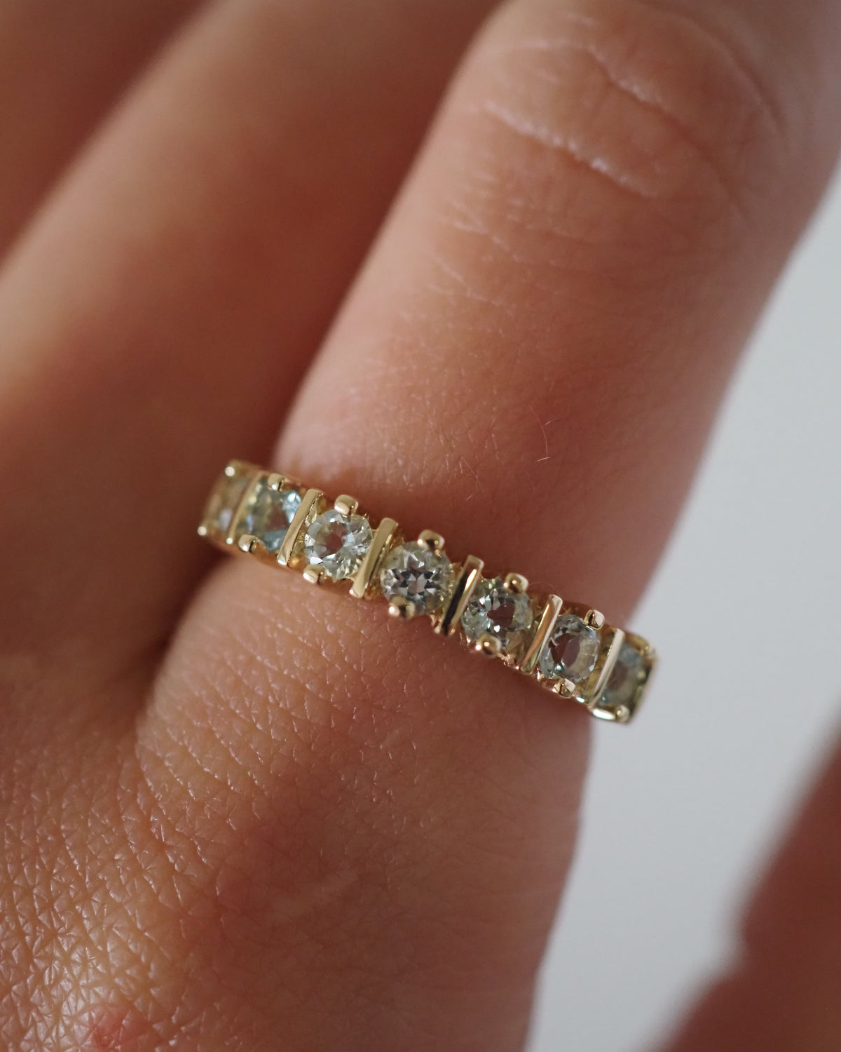 The Arabelle Ring features a row of natural aquamarines, each stone set with intention to create a continuous, shimmering line of pastel blue. Delicate yet full of presence, this design brings a serene glow to the hand — calming, fresh, and quietly striking.