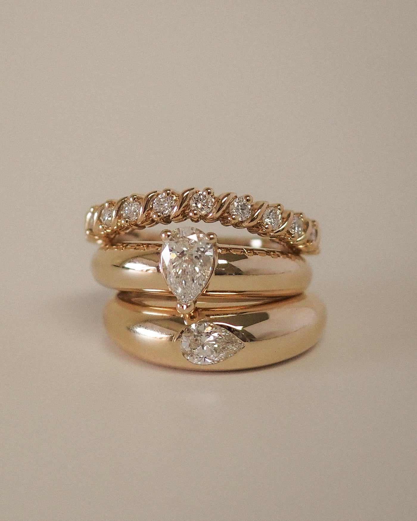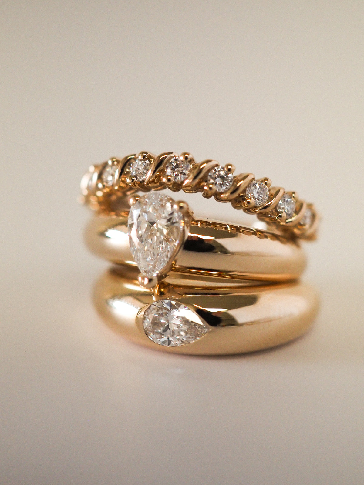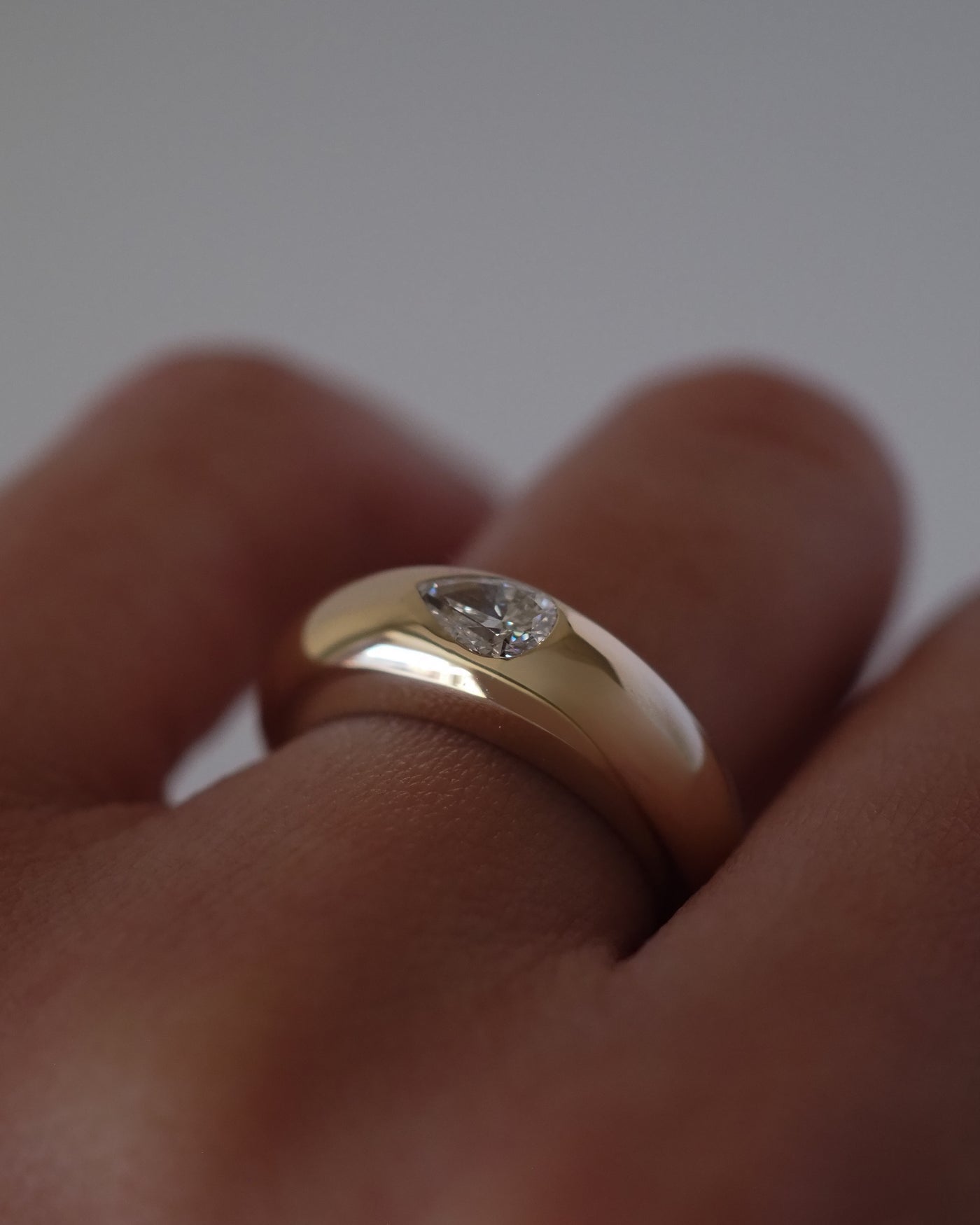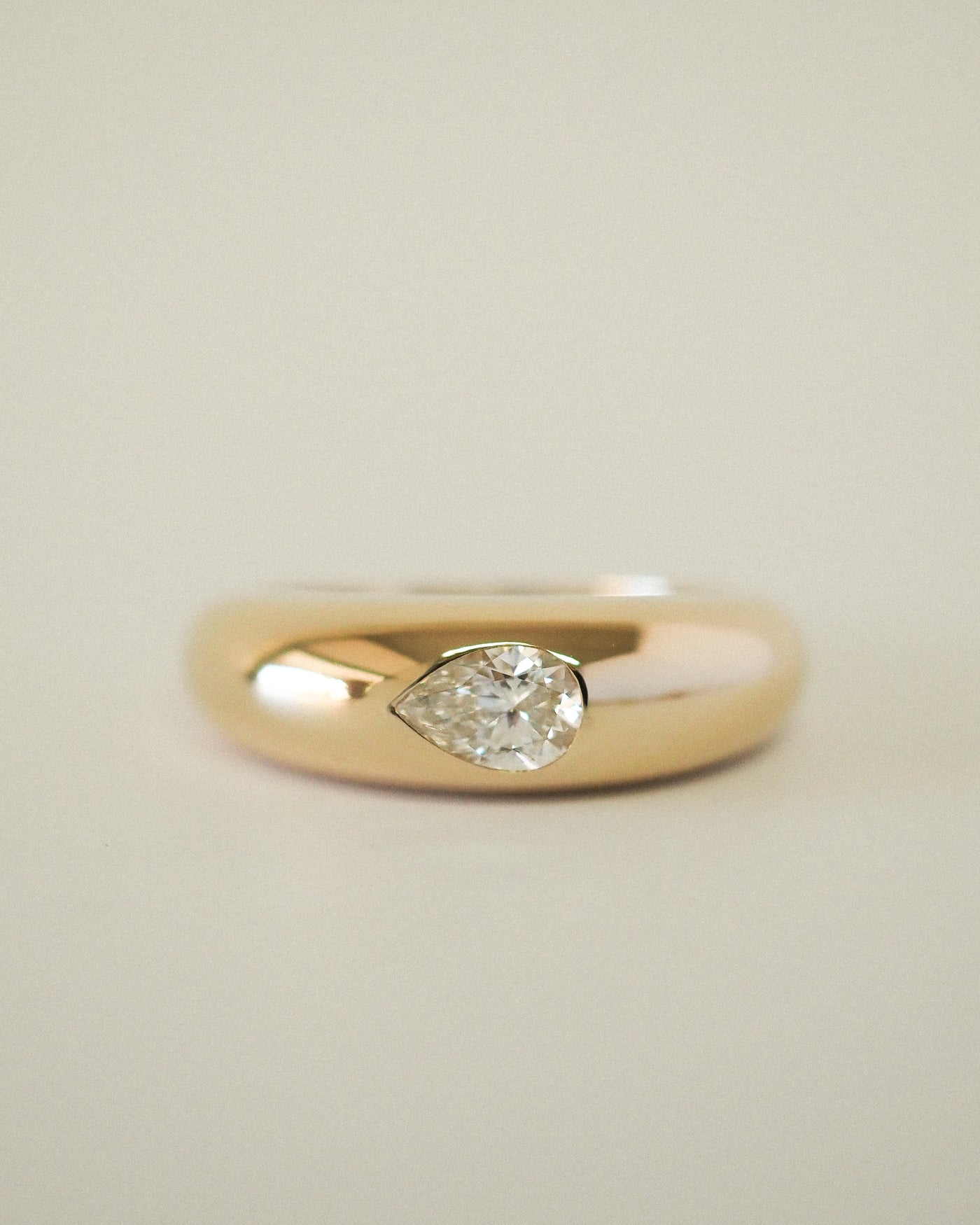 At its heart, a pear-cut diamond rests gently within a sculpted gold band—nestled, protected, and embraced as if it has always belonged there. Its soft teardrop shape evokes tenderness and devotion, a symbol of love that is felt more than spoken.